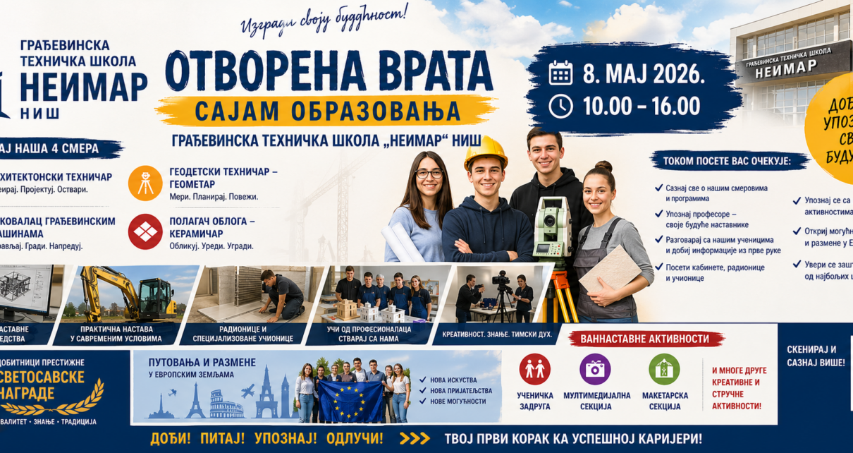 Са великим задовољством позивамо ученике завршних разреда основних школа да у петак, 8. маја 2026. године, у периоду од 10.00 до 16.00 часова, посете нашу Грађевинску техничку школу „Неимар“ у Нишу и присуствују Дану отворених врата наше школе.